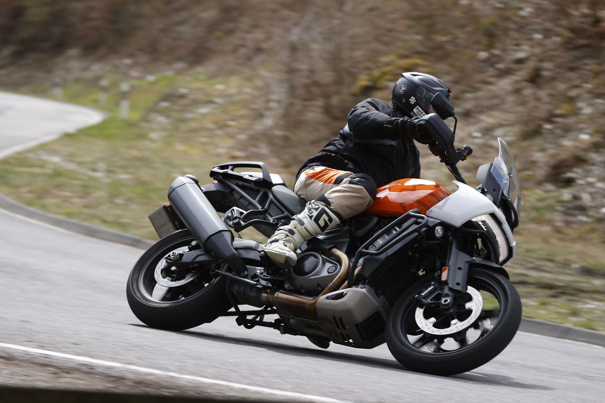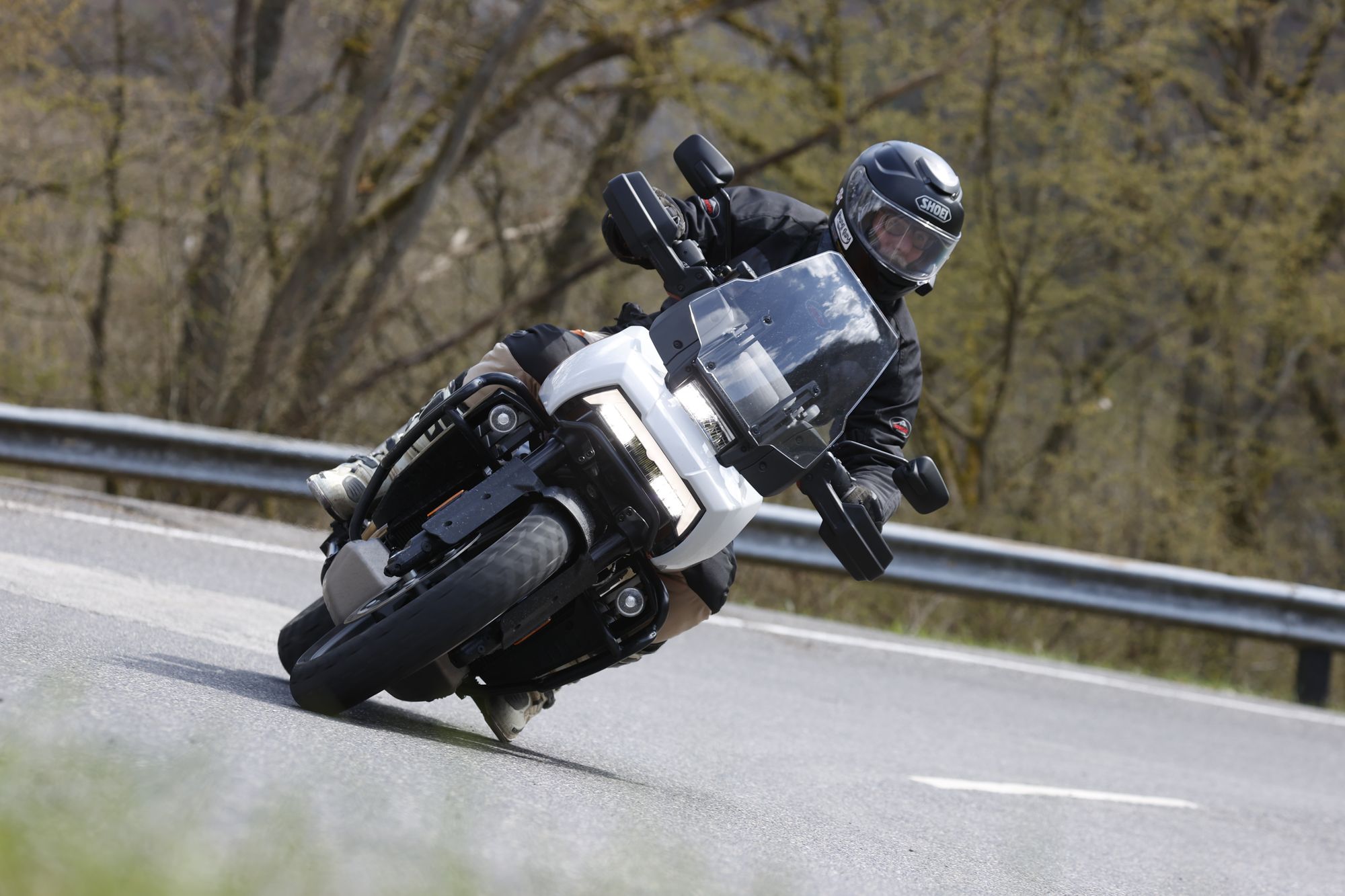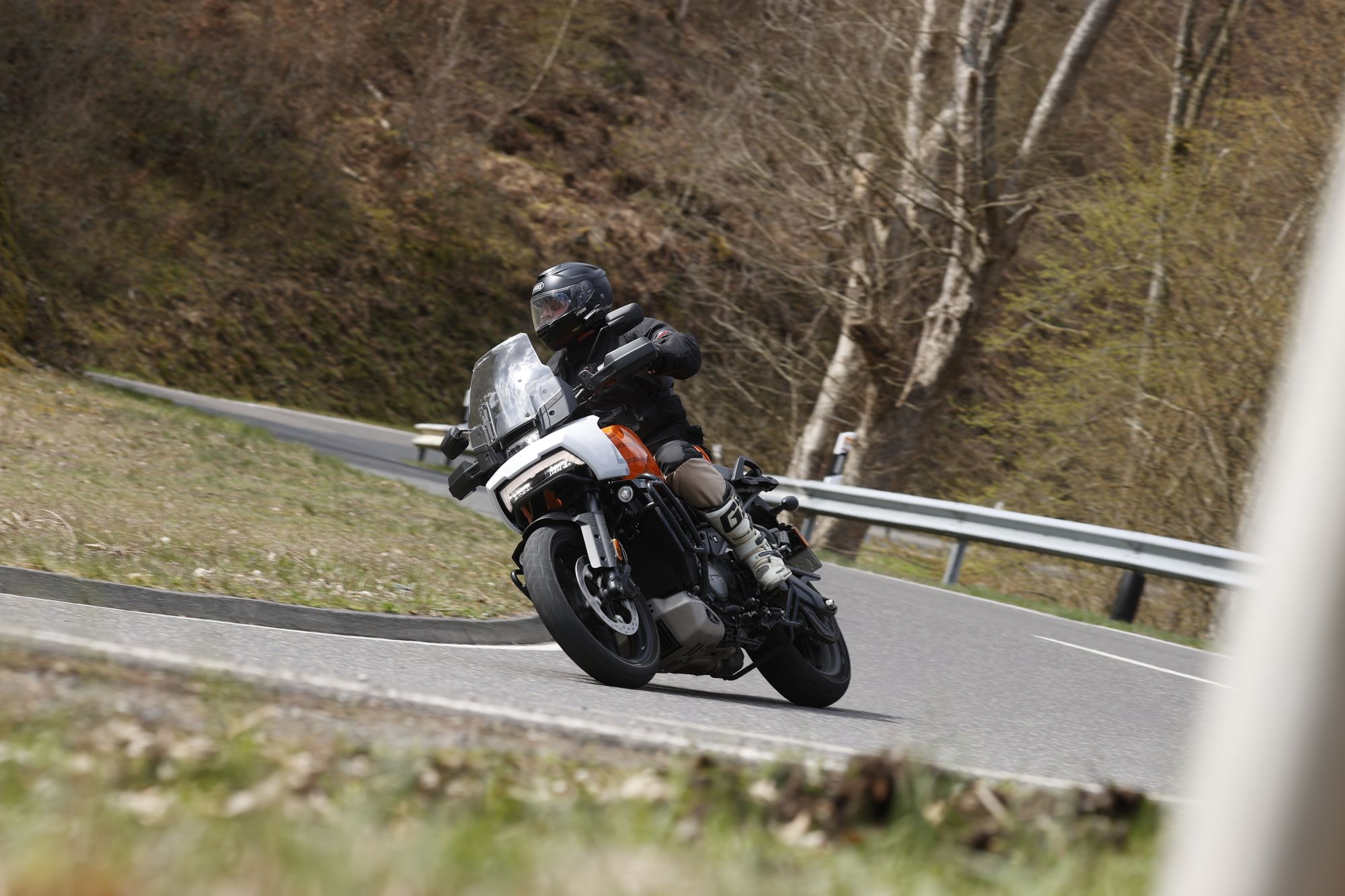 Anderntags nahmen wir eine 200-Kilometer-Tour unter die Räder: Von einer breit ausgebauten Landstrasse über kurvenreiche schmale Strässchen mit allen möglichen Belagszuständen bis hin zur Autobahnetappe war alles im Angebot. Feuchte Stellen, Dreck oder Nässe auf der Fahrbahn beeindruckten die Pan America nicht. Per Knopfdruck wechsle ich die Fahrmodi Road, Sport und Rain, die sich deutlich unterscheiden. Das Touch-Display ist gut ablesbar. Die Armaturen sind ergonomisch positioniert und lassen sich intuitiv bedienen. Das Fahrerlebnis kann ich am besten mit dem Begriff souverän zusammenfassen. Im gesamten Drehzahlbereich steht mehr als genug Power zur Verfügung, gut dosierbar. Macht Laune.